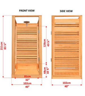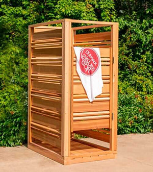 The Cloudburst Outdoor Shower features a modern privacy wall design with a self closing door mounted with stainless steel hinges. Enjoy this free standing outdoor shower at your cottage or in your backyard to cool down after a sauna session, swim in the lake or pool or to rinse down after relaxing in your hot tub. Handcrafted with western red cedar and shipped in an easy to assemble kit the Cloudburst Outdoor Shower is a popular design.