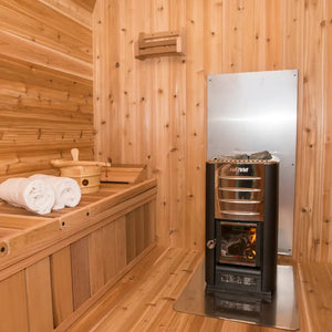The wood-burning heater is the most traditional option. If you install your sauna in a location without easy access to electricity and know how to light a fire yourself, the wood-burning heater is an excellent choice that we highly recommend. The glass window of the wood stove’s inside feed shows the natural light of the fire inside the sauna, making your sauna experience perfect!